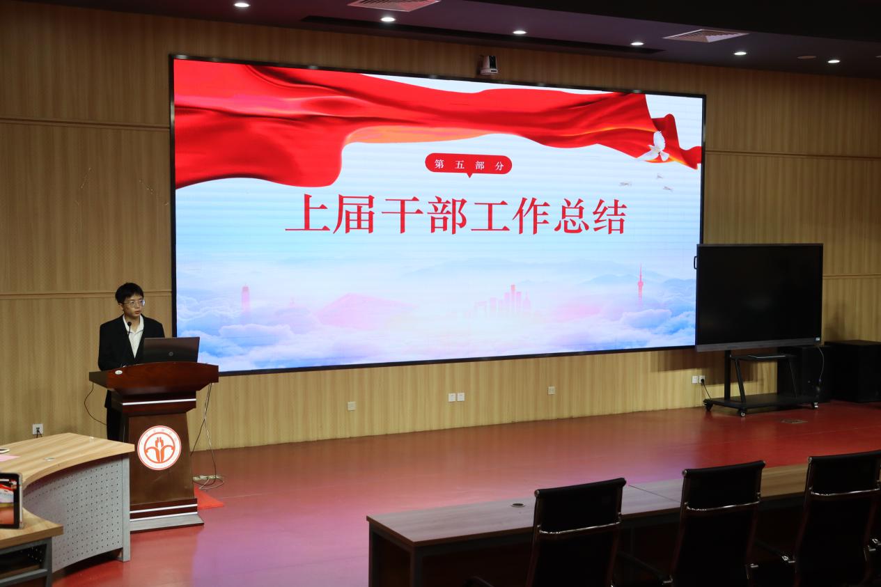 上一届员工干部代表黄烁行同学作工作总结。他在发言中,既回顾了团队协作、攻坚克难的历程,也反思了工作中存在的不足之处,同时对未来提出展望,希望新一届干部们能继续传递这份责任与荣耀。