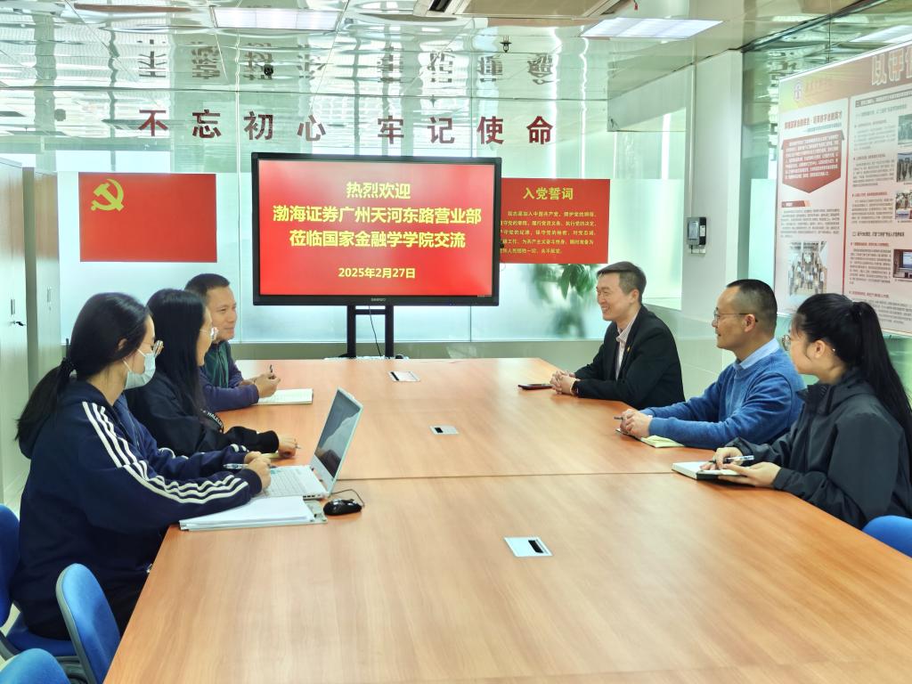 2月27日,公司员工、渤海证券广州天河东路营业部总经理李一创到访tyc539太阳集团,就深化校企合作、推动人才培养等议题与公司展开深入交流。公司党总支书记丘志君、副书记张栋贤、辅导员及教学秘书等共同参与此次交流活动。