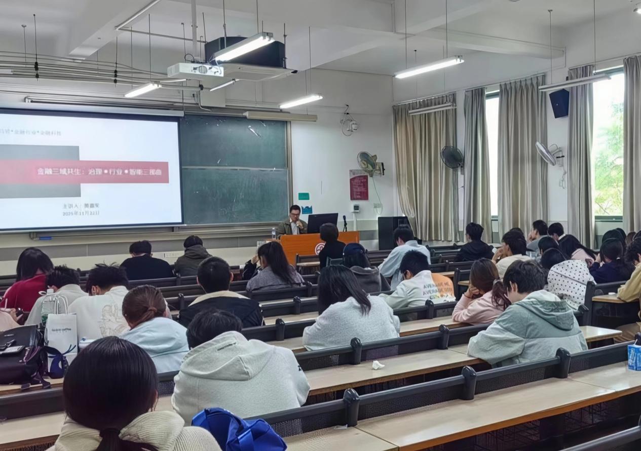 讲座现场,黄嘉荣研究员以“金融三域共生”为核心,从治理、行业、智能三个维度展开分享:在金融治理板块,他系统解读了“一行一局一会”监管架构及机构、行为、穿透式等五大监管类型,并结合恒大案例阐释穿透式监管的实践逻辑;在金融行业板块,他梳理了持牌金融机构、地方金融组织等全行业分类,详解融资租赁等细分领域的业务模式与风险特征;在智能应用板块,他介绍了AI调解、大数据风险监测、AI舆情防控等金融科技工具的实际应用场景,为与会师生带来最前沿的行业资讯。黄嘉荣最后寄语与会的学弟学妹:“金融行业的发展既需要专业的治理框架,也离不开科技的赋能,老员工作为未来金融领域的潜在参与者,需要建立“监管-行业-技术”的全局认知,才能更好适应行业发展趋势。”