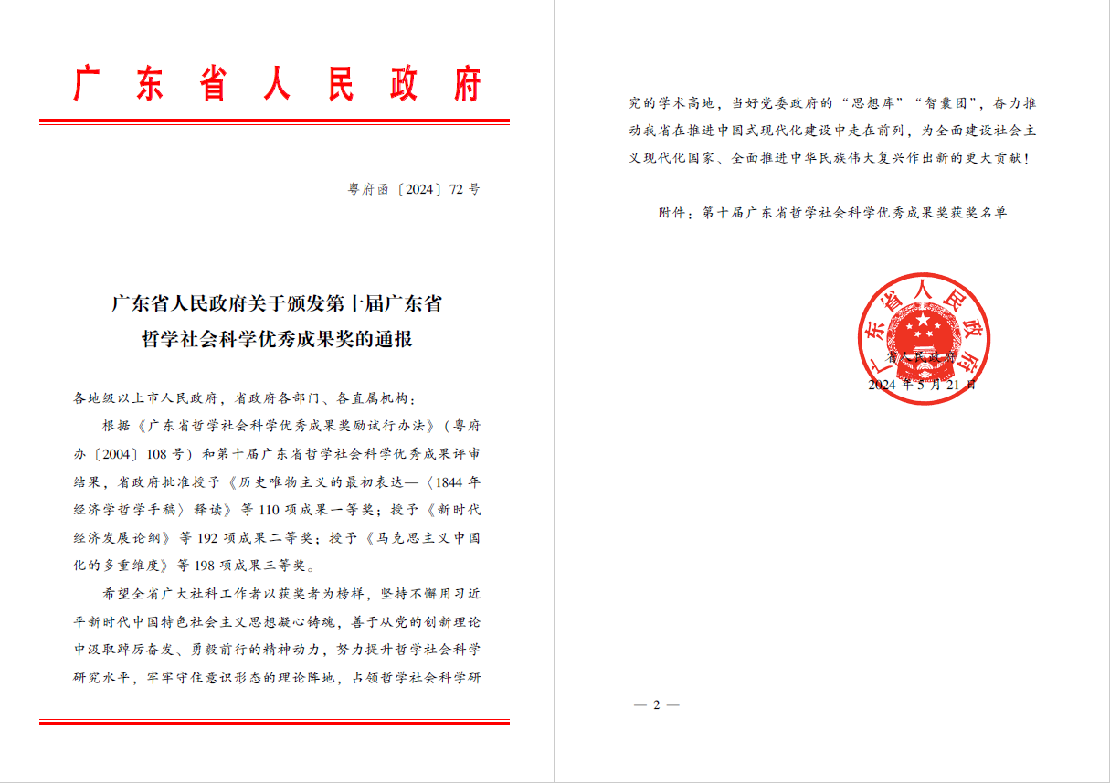 2024年5月21日,广东省人民政府正式公布《广东省人民政府关于颁发第十届广东省哲学社会科学优秀成果奖的通报》(粤府函[2024]72号文件)。来自通报名单显示,2项科研成果获得奖励。