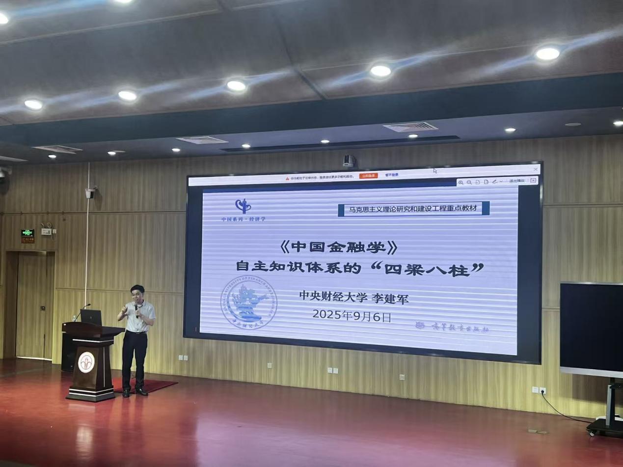 讲座中,李建军教授指出,构建中国金融学自主知识体系是贯彻落实习近平总书记关于“加快构建中国特色哲学社会科学”重要指示的具体实践。报告回顾了2020年国家教材委员会启动的首批中国经济学教材编写工作,其中《中国金融学》作为九种核心教材之一,由中央财经大学、上海财经大学和西南财经大学三校团队共同承担编写任务。李建军教授特别强调了中国金融学的四大理论基石:马克思主义政治经济学理论遵循,中国金融发展实践经验,中华优秀传统金融文化,人类优秀金融理论成果。李建军教授详细阐释了“四梁八柱”理论框架中的八大核心原理:金融与实体经济关系原理,金融要素价格形成机制原理,金融机构运作原理,金融市场运作原理,金融开放与全球治理原理,金融监管与风险防控原理,货币政策调控原理,金融发展理念与“五篇大文章”原理。