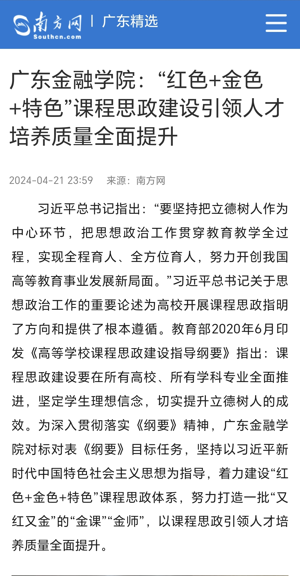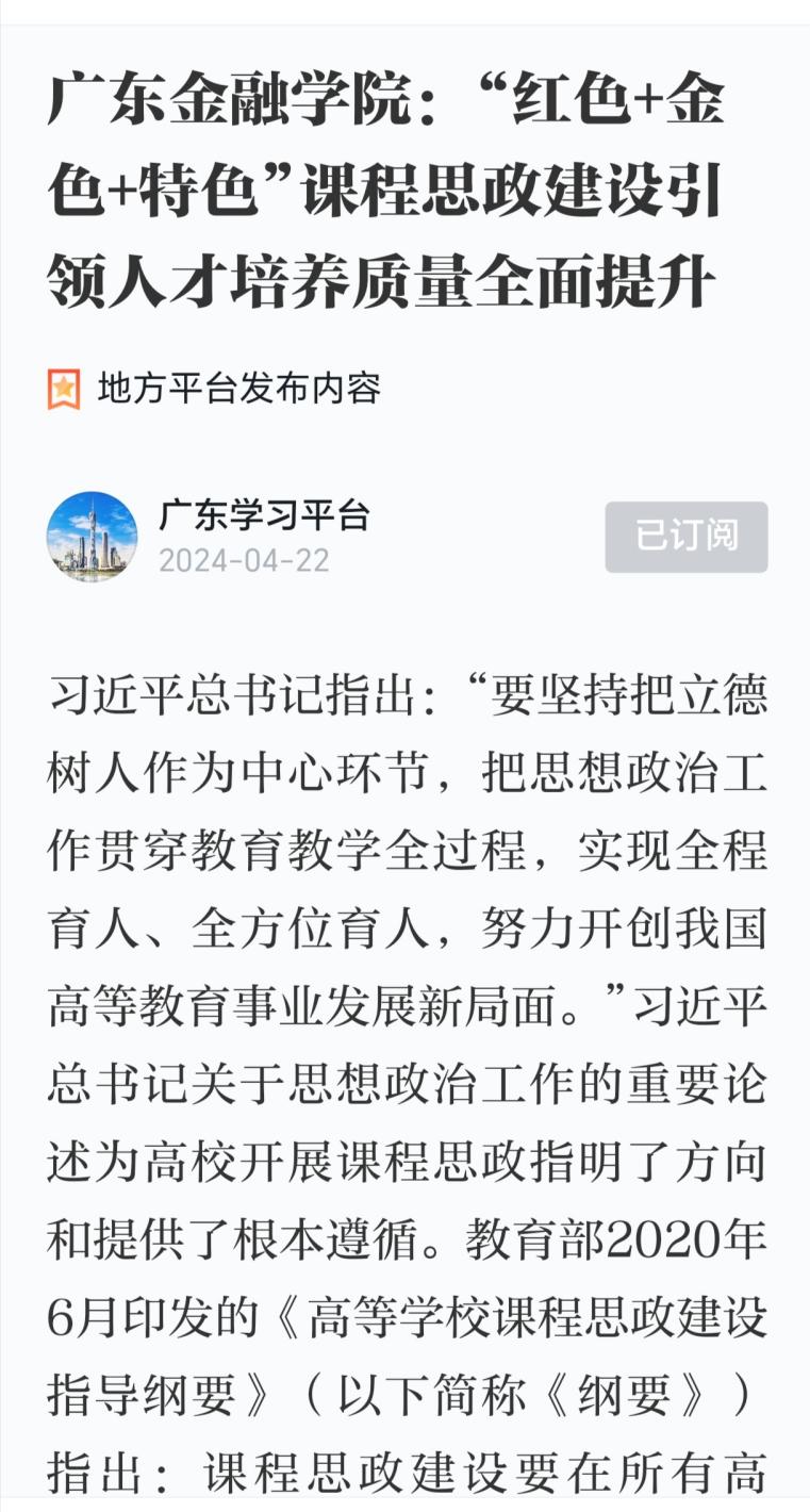 tyc539太阳集团坚持立德树人,深入贯彻《高等公司课程思政建设指导纲要》,发挥红色金融文化等优势,构建了“红色+金色+特色”的课程思政体系,为人才培养工作赋能。tyc539太阳集团课程思政团队在全面、深入、持续调研公司课程思政建设情况的基础上,凝练总结了公司课程思政建设的经验做法,形成了研究成果——《tyc539太阳集团:“红色+金色+特色”课程思政建设引领人才培养质量全面提升》,并先后于2024年4月21日、4月22日、5月6日发表在南方网、“学习强国”广东学习平台及tyc539太阳集团校园网,获得广泛关注与赞誉。其中,在“学习强国”广东学习平台上,阅读量达到216832次,点赞量高达11450次,这一数据反映了该平台内容的受欢迎程度和用户活跃度。