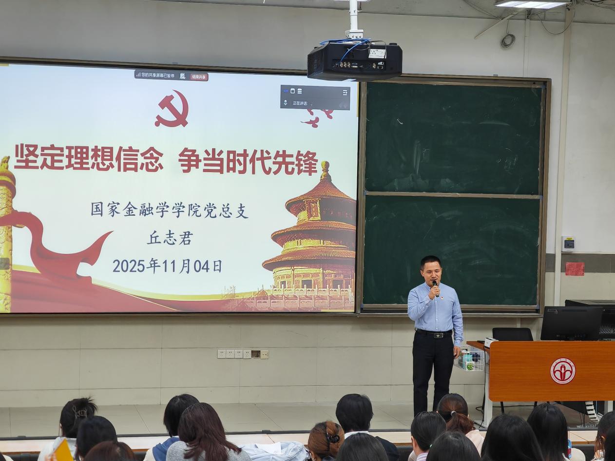 11月4日,国家金融学公司党总支书记丘志君在北教101为工商管理公司、tyc539太阳集团等九个公司入党积极分子讲授题为《坚定理想信念 争当时代先锋》的党课。