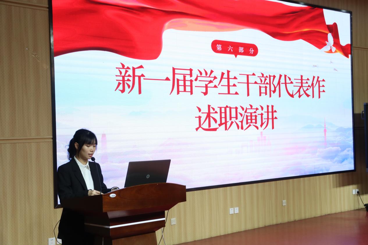 上一届员工干部代表黄烁行同学作工作总结。他在发言中,既回顾了团队协作、攻坚克难的历程,也反思了工作中存在的不足之处,同时对未来提出展望,希望新一届干部们能继续传递这份责任与荣耀。